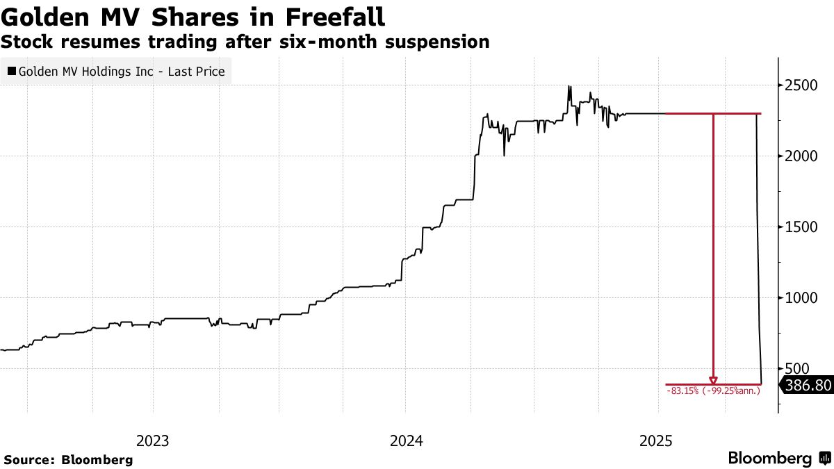 Property developer Golden MV Holdings Inc. began falling on Thursday after regulators lifted a six-month trading suspension on the stock. So far it’s down 83%, its worst streak as a public company.